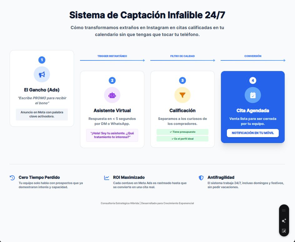 La mayoría de las agencias venden "hacks" o volumen de leads (cantidad). Nosotros vendemos arquitectura de procesos (calidad). No somos una agencia de ejecución masiva, sino una consultoría de ingeniería de negocios.